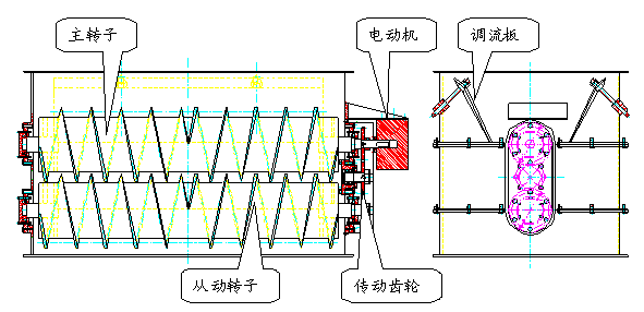 在布料裝置的實際使用當中,我們發現在設備的使用當中存在這嚴重堵煤的現象,大量的煤粘結在主轉子上埋沒絞籠,使整個轉子變成一根毫無作用的圓筒,無法均勻布料,于是我們在此經驗基礎上進行優化設計,在原設備上加裝了一根從動轉子,使從動轉子與主轉子同步運行,同時從動轉子的絞籠插到主轉子絞籠內,在轉動的過程中,利用從動轉子的絞籠將粘結在主轉子絞籠內的煤除掉,達到了防止布料裝置堵煤的特殊效果。